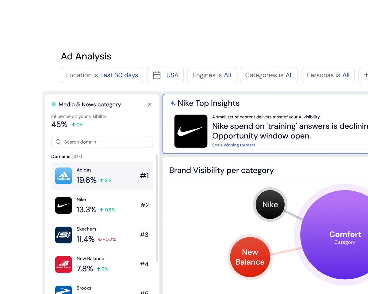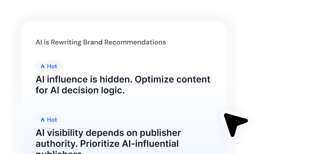 Our influencing feature finds the sources that shape how AI talks about your brand. We analyze these sources and help you build strategies to improve how AI portrays you, boost your visibility, and keep messaging consistent across different AI platforms.