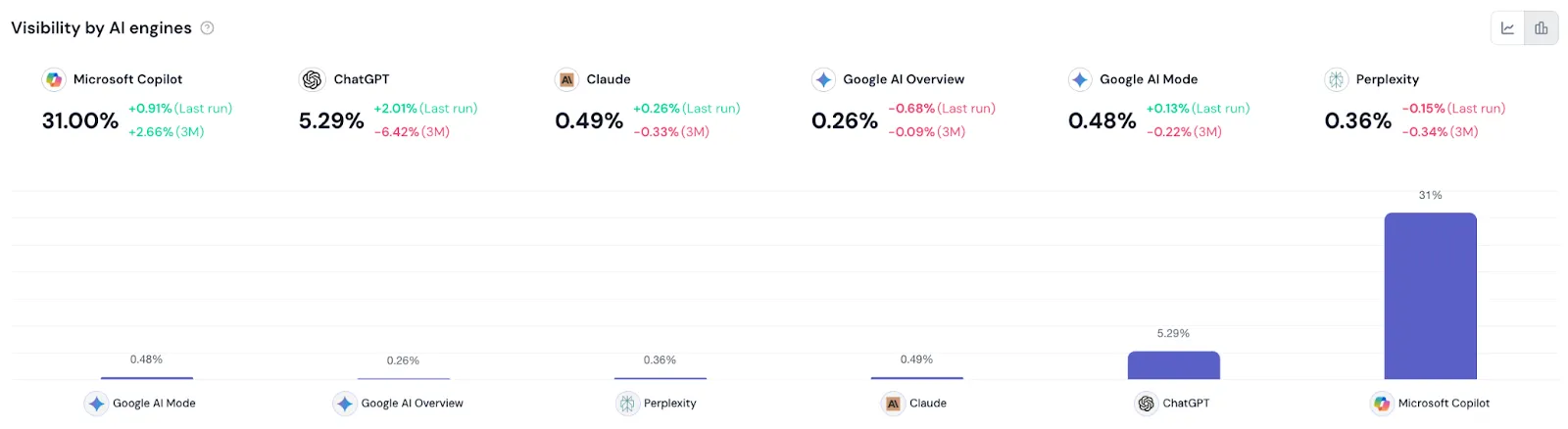 Perhaps the most significant finding from our analysis: Microsoft Copilot commands 31% of visibility in the institutional investing category—making it the predominant AI engine for investor discovery in this space.