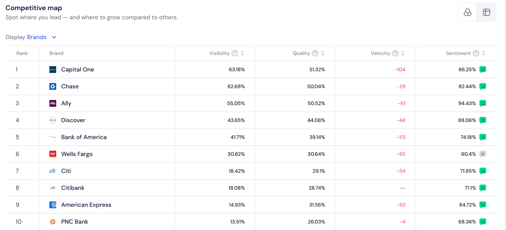 Consider the financial services sector. Our analysis of consumer banking prompts showed Ally Bank outperforming many of its established, larger competitors by a significant margin in AI visibility.