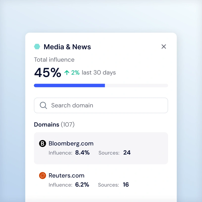 See the most influential domains per category/product models cite (publishers, retailers, forums, video).