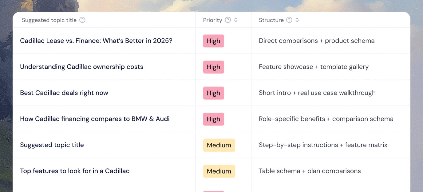 Guide your content teams with clear suggestions on content topics, giving them a clear direction on where to focus their efforts based on impact to visibility.
