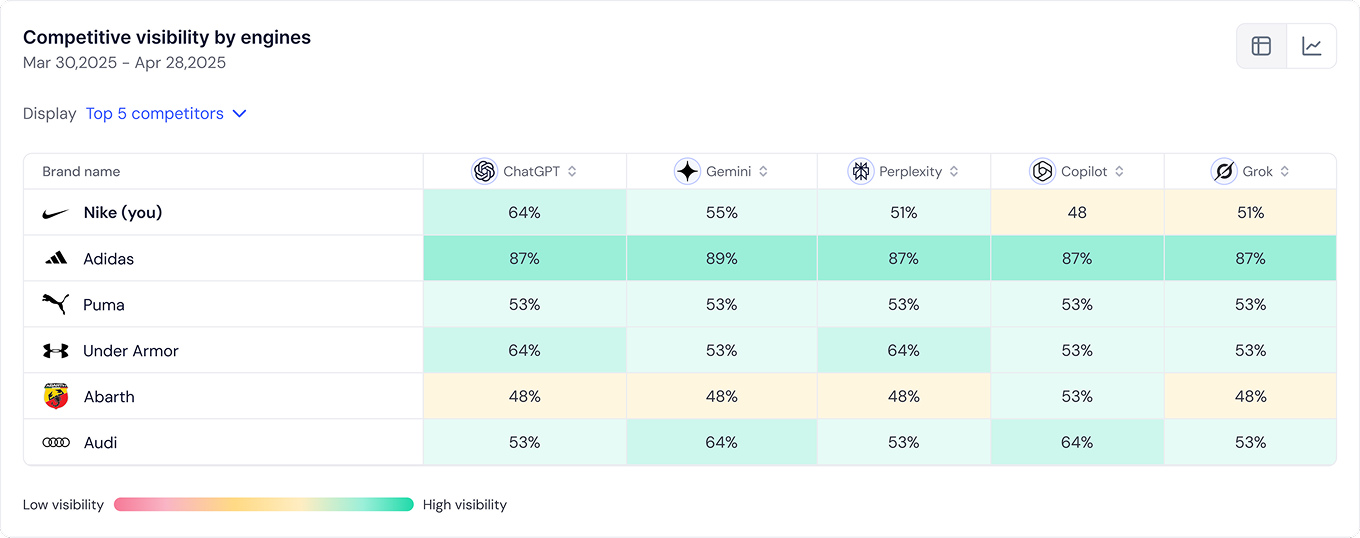 Track your visibility across all AI engines, see where & how your brand appears, and uncover insights to boost your visibility where it matters most.